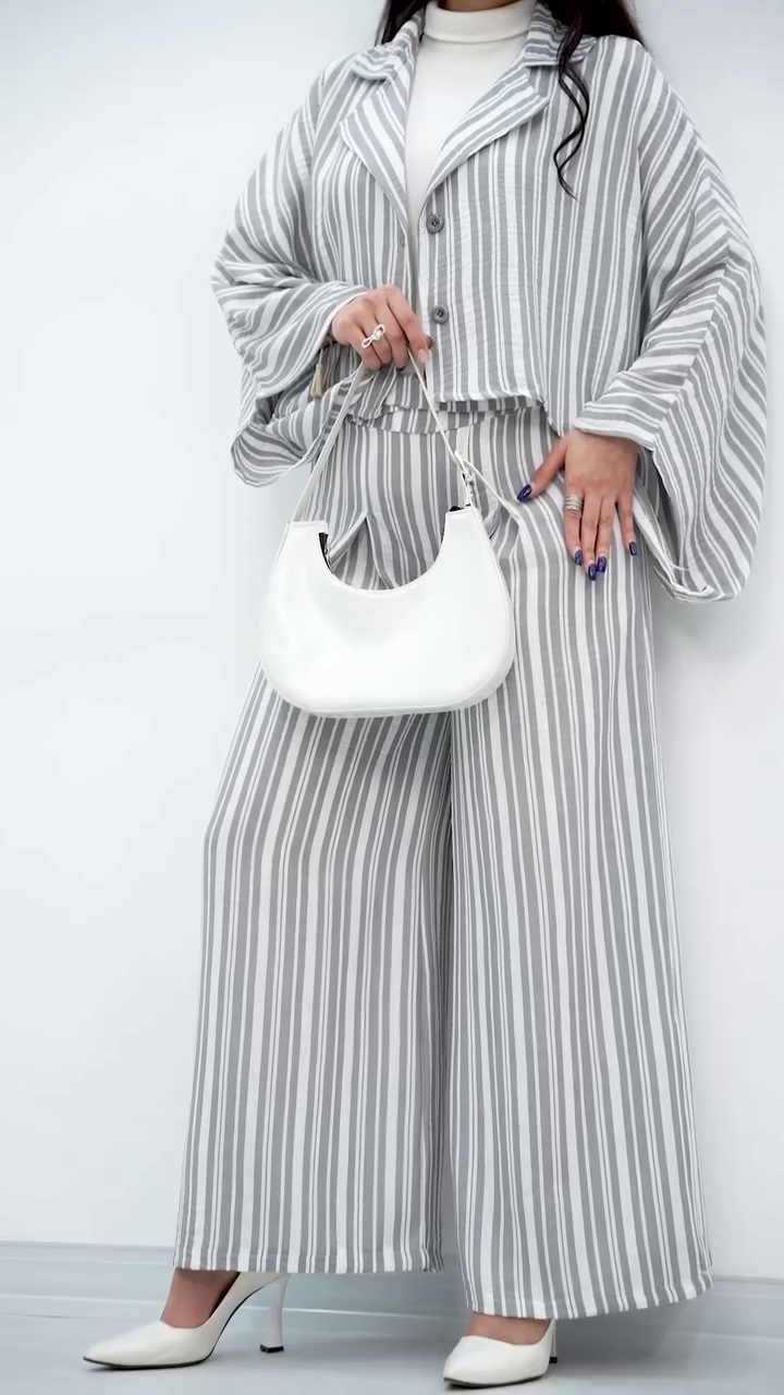 The trousers are high-waisted with a wide-leg cut, offering both comfort and sophistication. The vertical stripes enhance the lengthening effect, making the outfit visually slimming and elegant. A matching fabric belt cinches the waist, adding shape and refinement to the overall silhouette.