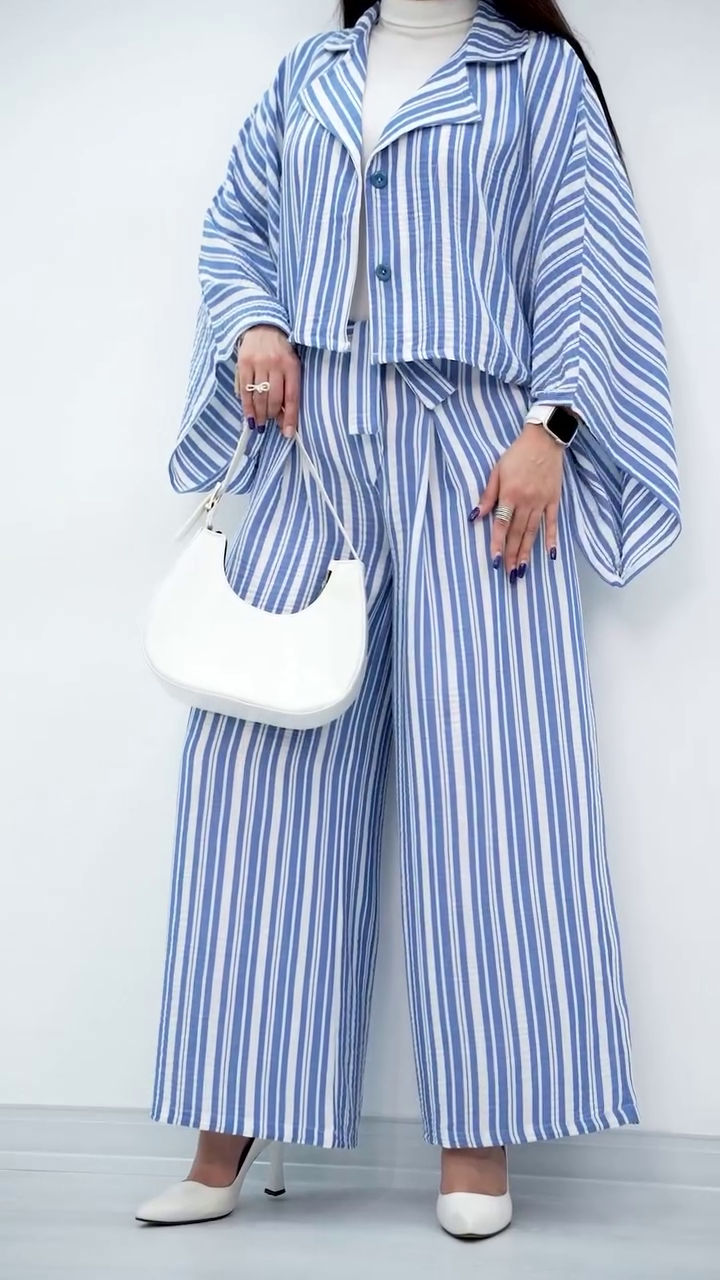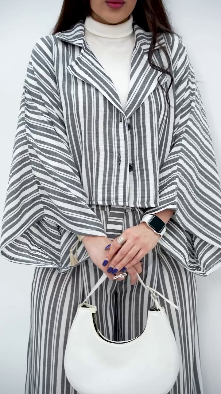 Overall, this striped co-ord ensemble represents refined minimalism with a fashionable twist, ideal for those who appreciate clean lines and bold sleeve details.