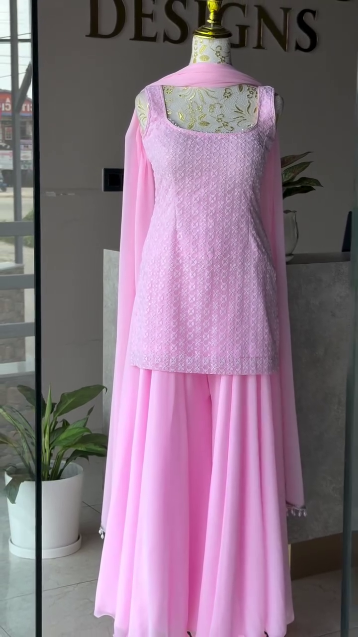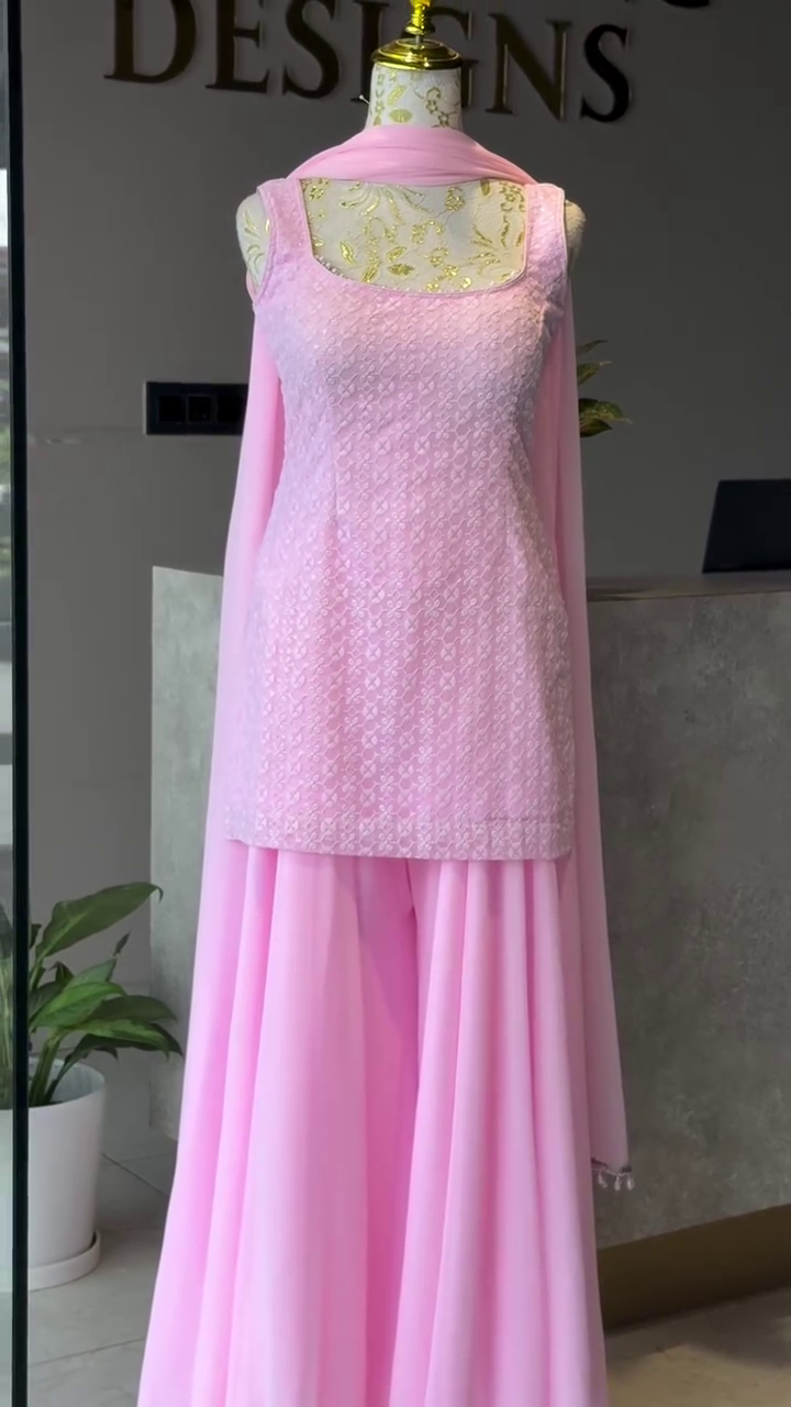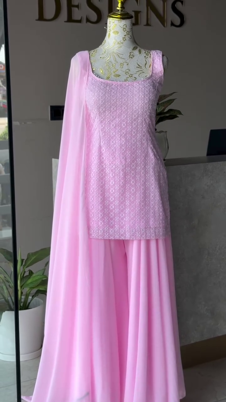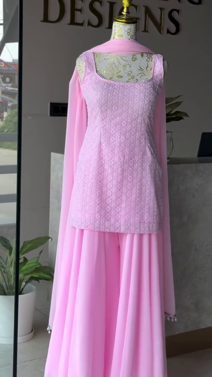 The palazzo pants complement the kurta beautifully with their wide-leg design, creating a soft, flowing movement that adds elegance with every step. The matching dupatta drapes effortlessly over the shoulders, completing the ensemble with refined grace. The minimal yet classy detailing makes this set versatile enough to accessorize in multiple ways—pair it with statement earrings and heels for festive wear or keep it subtle with flats for daytime events.