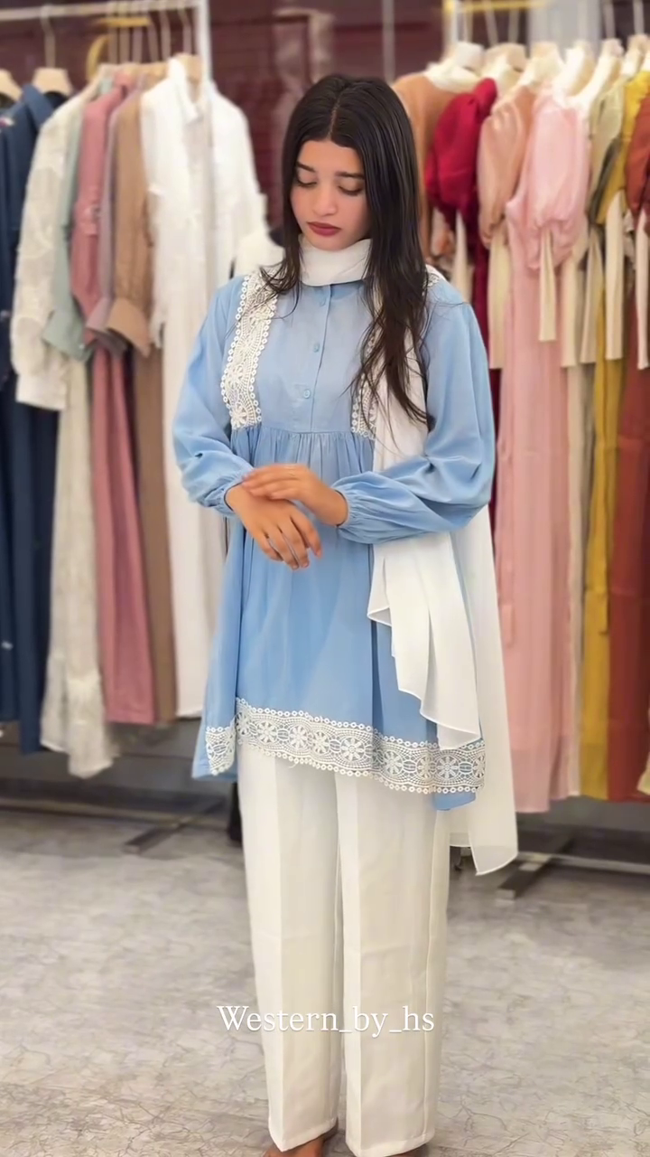 This image beautifully captures a serene and graceful outfit that blends simplicity with refined detailing. The model is wearing a soft sky-blue tunic paired with white straight-fit trousers and a flowing white dupatta, creating a calm and elegant color combination. The soothing blue tone gives the outfit a fresh and airy feel, making it ideal for daytime outings, casual gatherings, or semi-formal occasions.