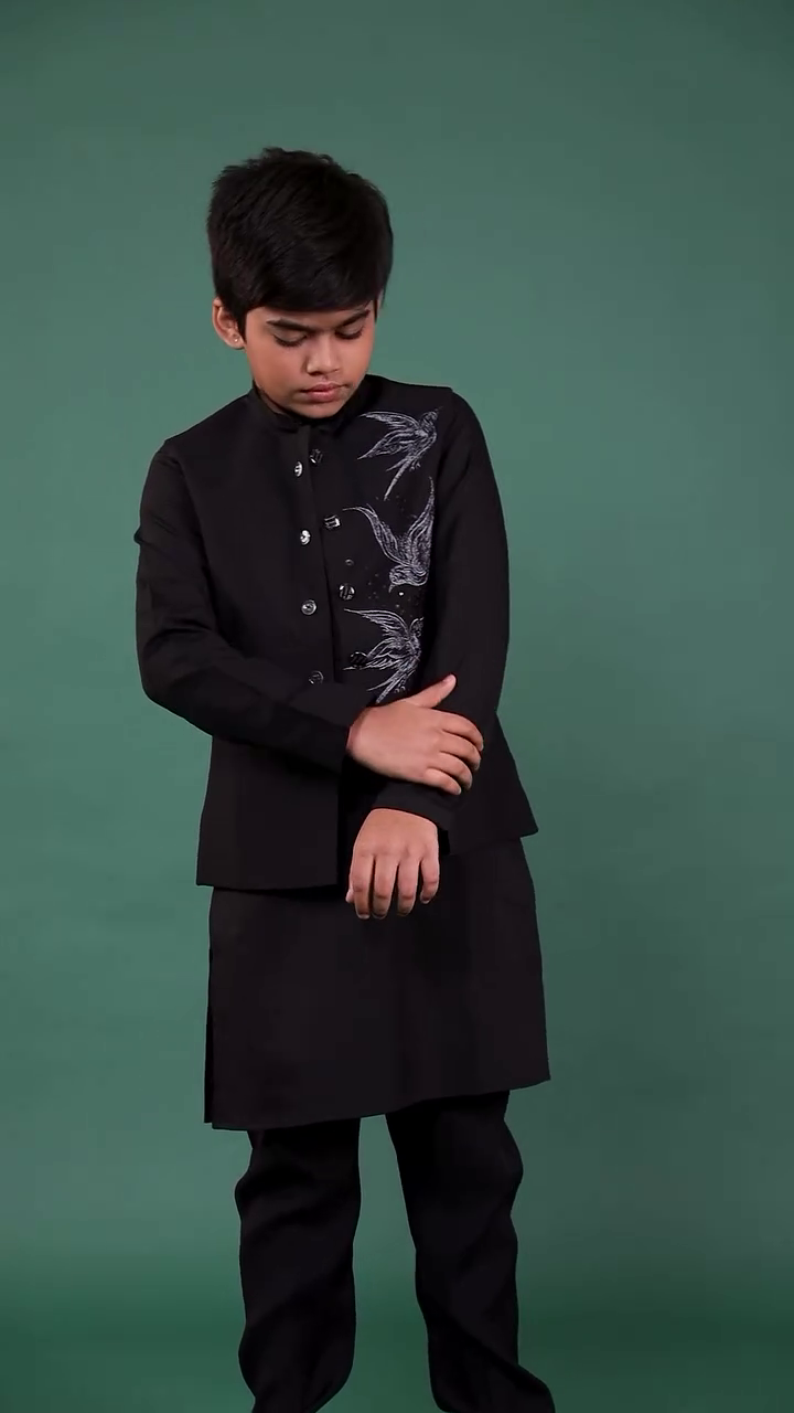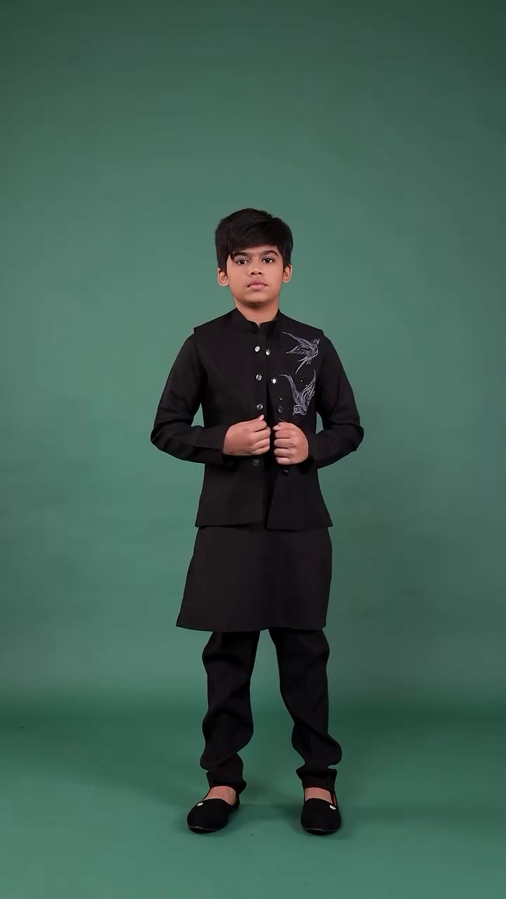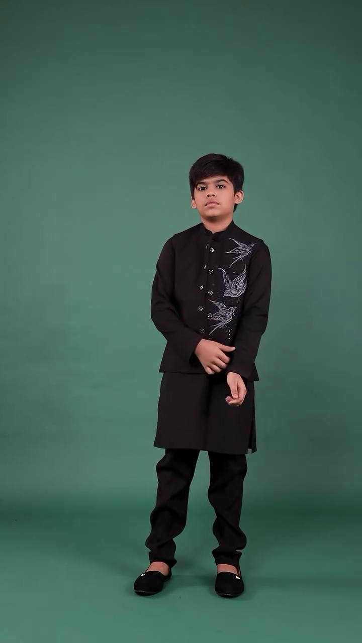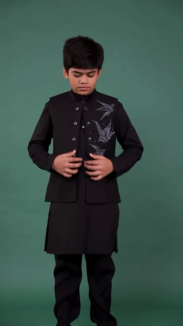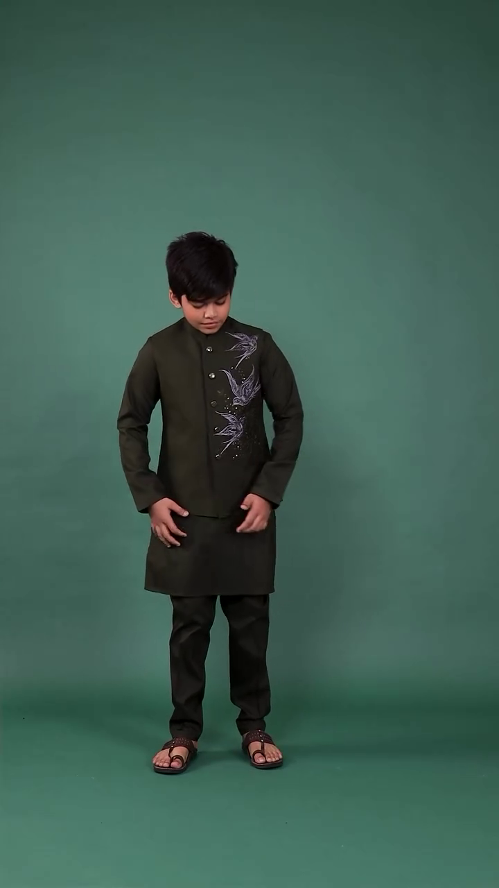 The deep green shade symbolizes elegance, freshness, and festivity. Its minimal yet detailed design makes it versatile enough for Eid celebrations, family gatherings, wedding functions, and festive photoshoots. The overall styling exudes confidence and grace, making it ideal for young boys who want to look sharp yet age-appropriate.