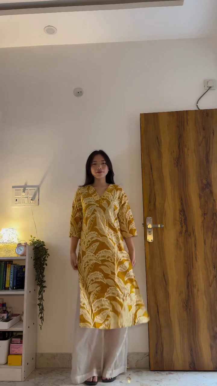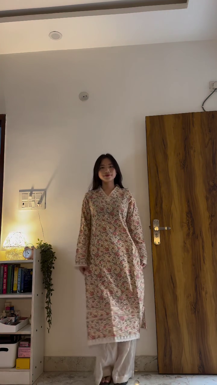 The model pairs the outfit with simple footwear, keeping the styling clean and understated. The neutral indoor setting further highlights the purity and softness of the ivory tone. This outfit is perfect for women who appreciate simplicity with refined detailing. It speaks of understated sophistication — a wardrobe essential that can easily transition from day to evening with just a change of accessories.