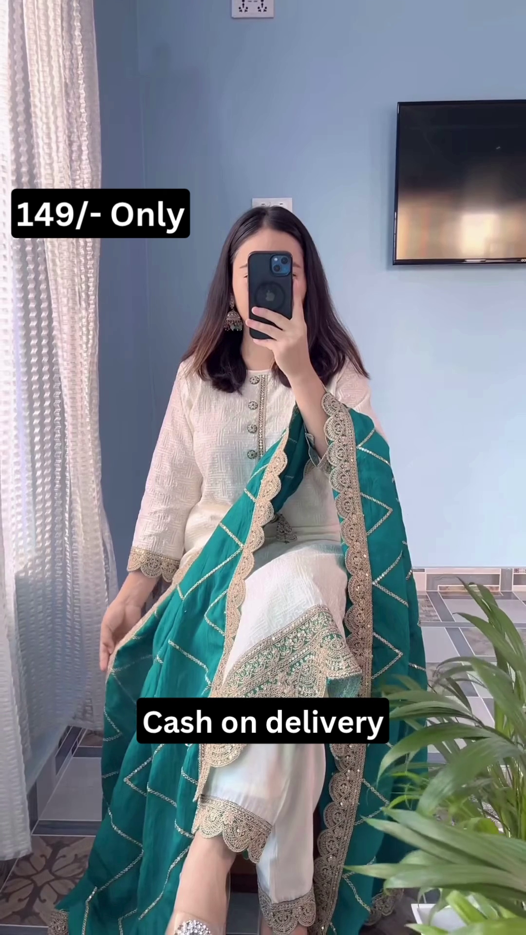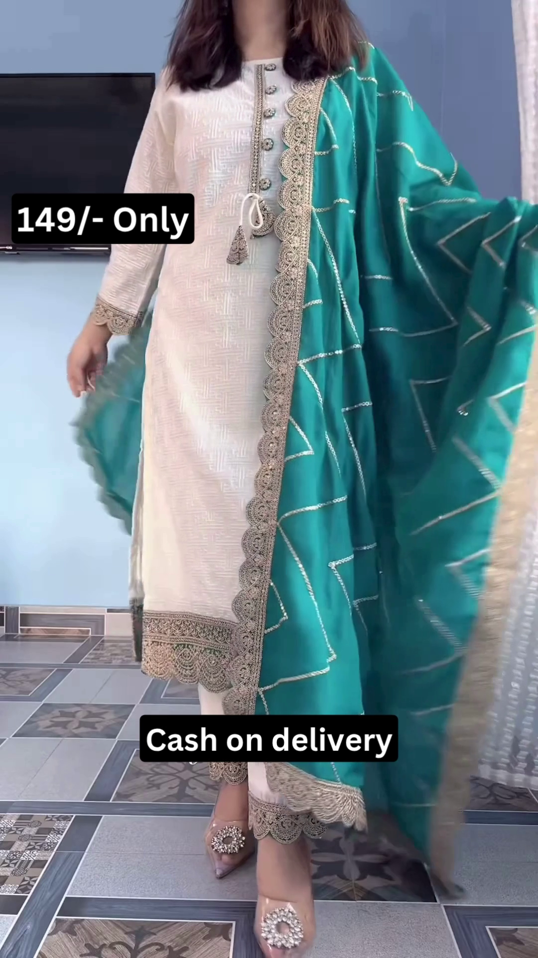 Priced at 149/- only with cash on delivery, this suit set offers outstanding value. It gives the appearance of a premium designer ensemble while remaining budget-friendly and accessible. The combination of timeless white, rich green, and intricate detailing makes it a versatile addition to any ethnic wardrobe.
