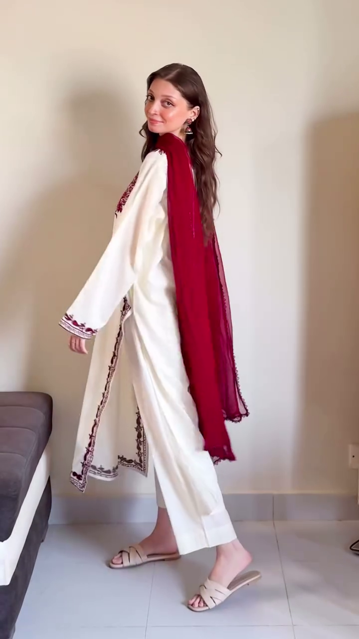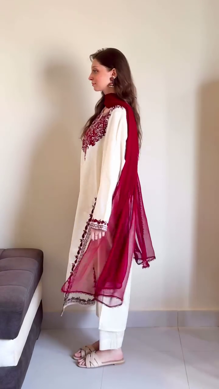 The matching ivory pants maintain simplicity, allowing the embroidered kurta to stand out. The deep red dupatta, crafted from sheer fabric, adds drama and elegance to the outfit. Its lightweight texture flows beautifully, completing the ensemble with grace.
