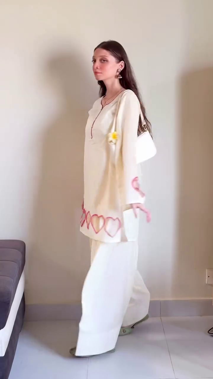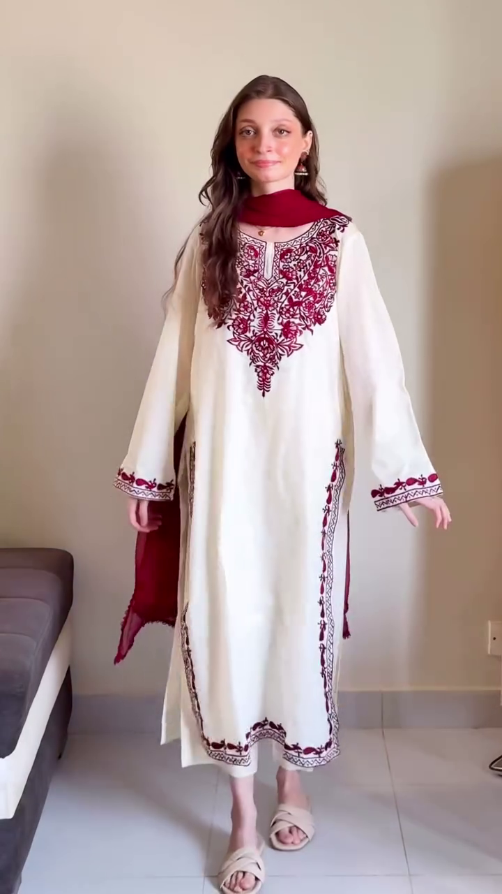 The ivory base creates a soft and graceful foundation, while the rich red embroidery adds depth and sophistication. The straight-cut kurta offers a clean silhouette, making it flattering and versatile. The full sleeves with embroidered borders enhance the detailed aesthetic.