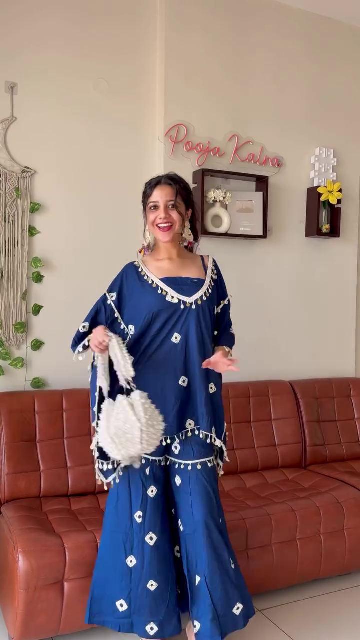 The kurta features intricate mirror-work inspired detailing along the neckline and central panel, creating a striking focal point. The wide sleeves and draped cut provide maximum comfort while maintaining a flattering shape. The tassel-style edges add a playful finish to the garment.
