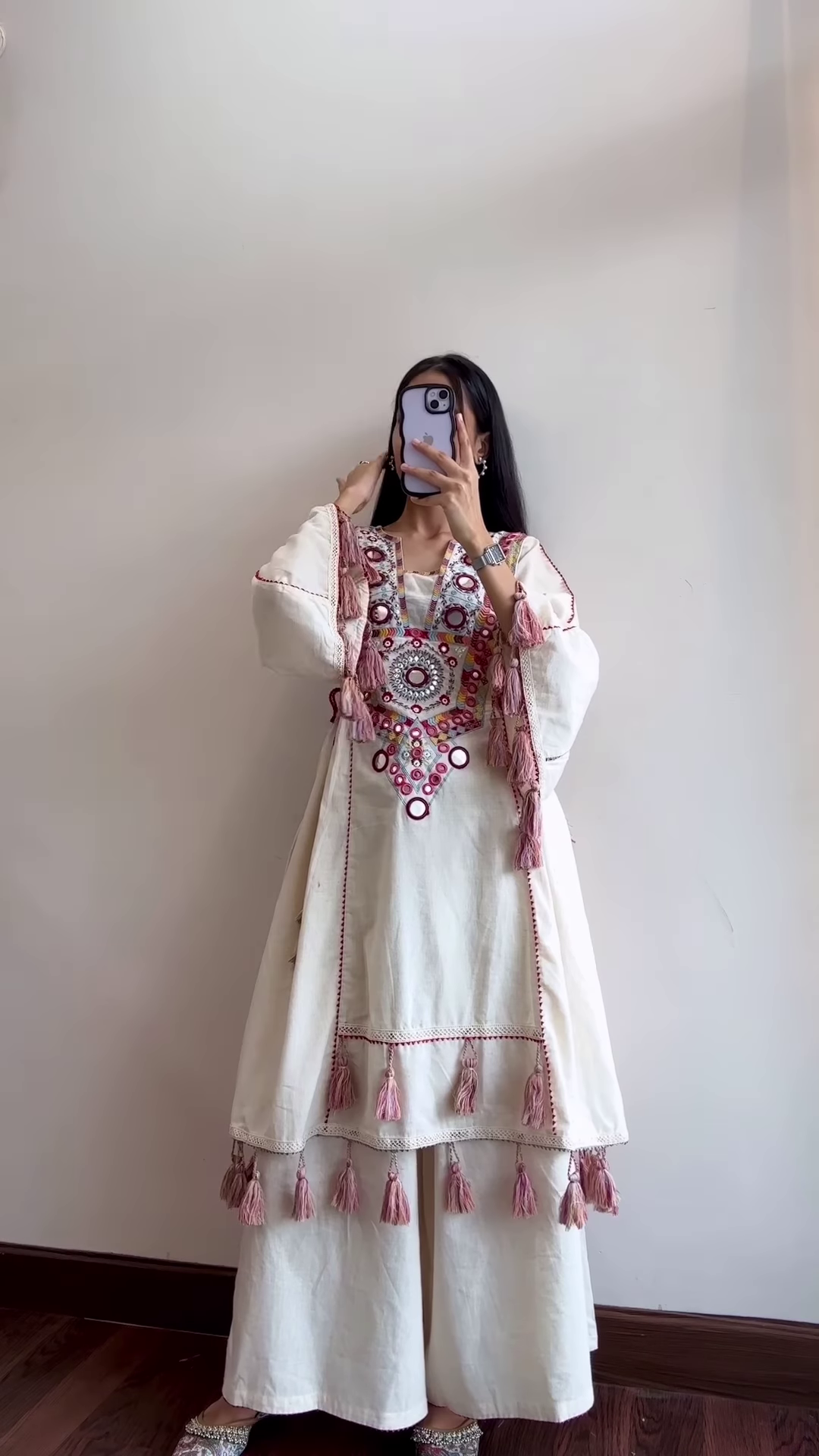 This cream-colored kurti set is a perfect blend of traditional design and modern fashion. The highlight of this outfit is the beautifully detailed neckline featuring intricate patterns and stylish tassels that add a unique and eye-catching touch. The soft cream base enhances the colorful embroidery, making it look vibrant yet elegant.