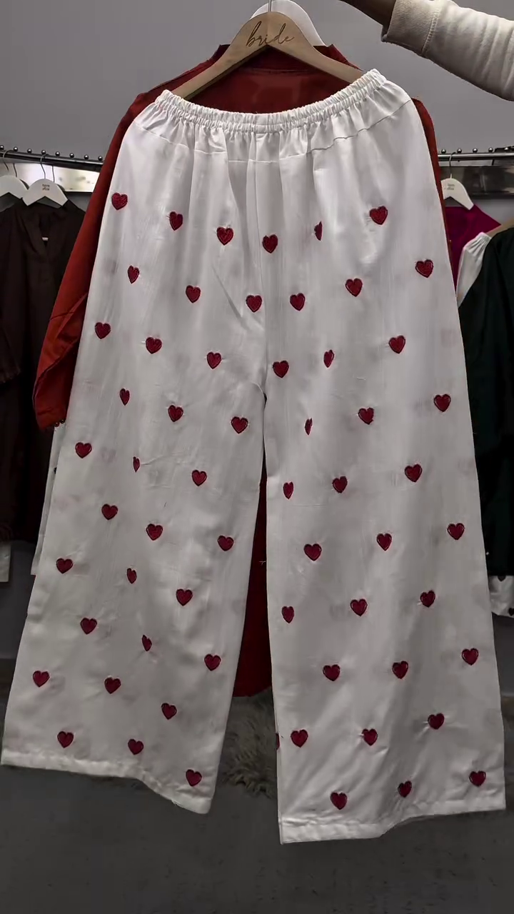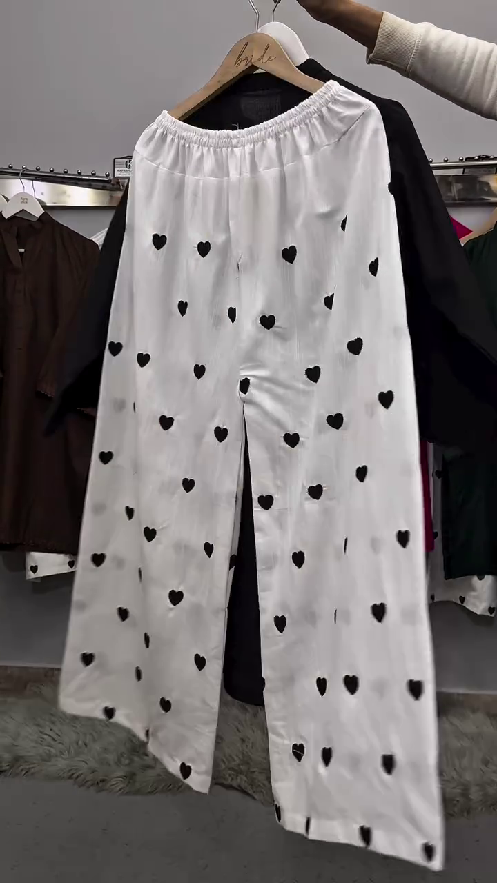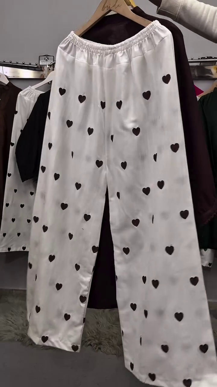 These white palazzo pants feature scattered heart prints that add a fun and charming detail. The wide-leg design ensures comfort and breathability, making them ideal for casual wear.