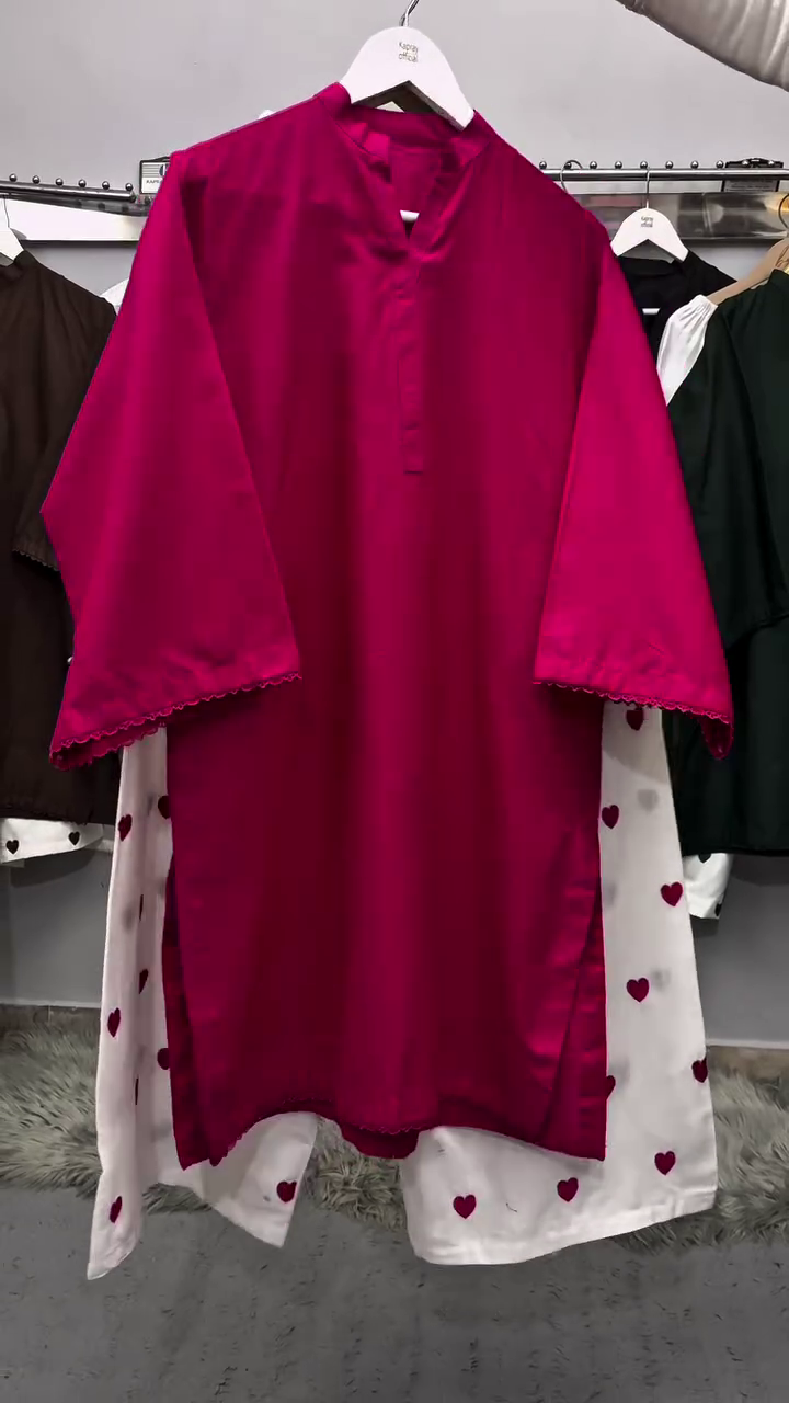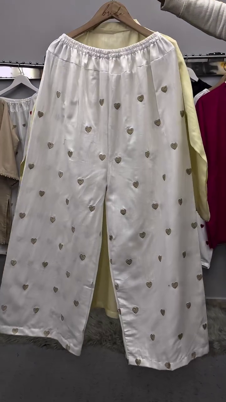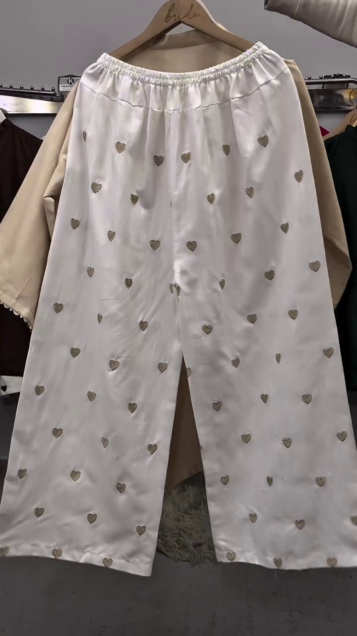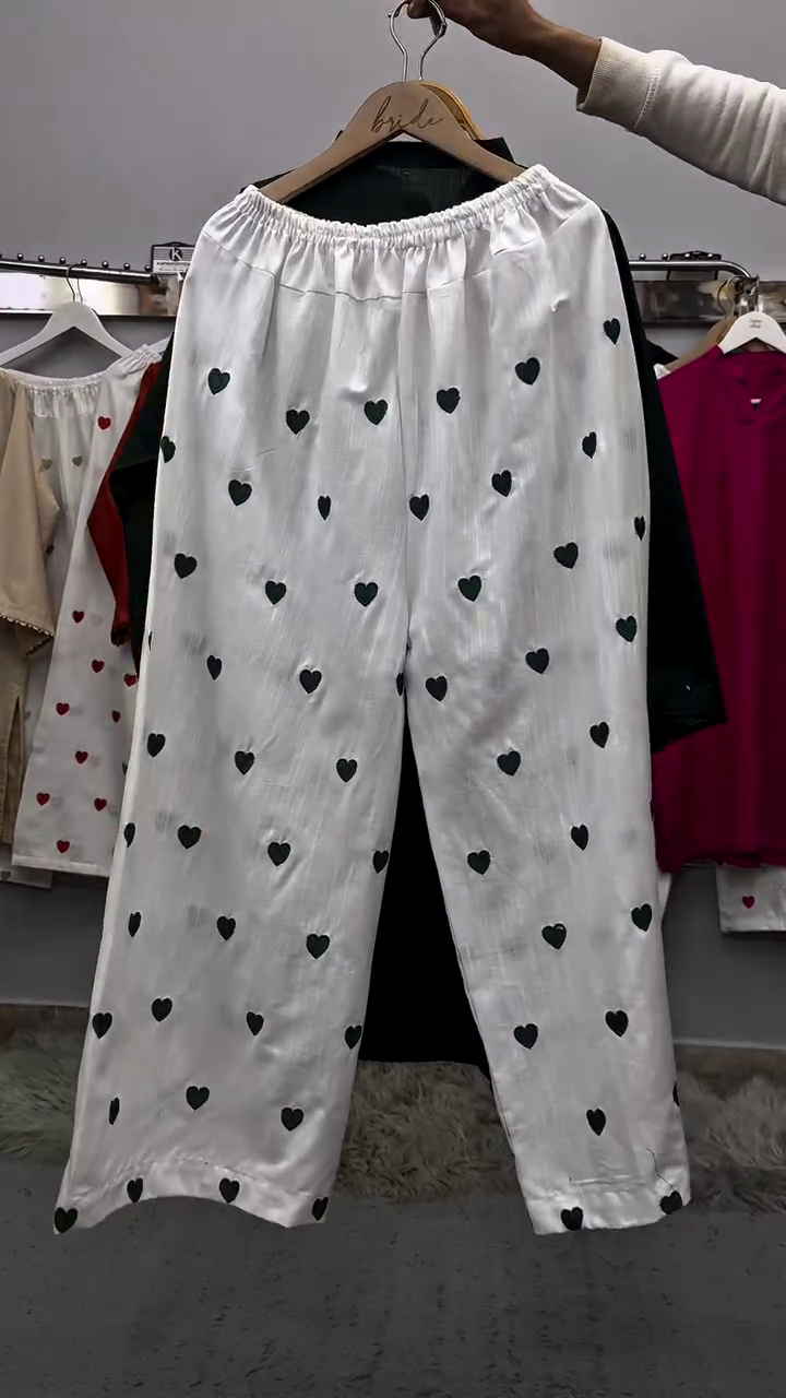 These white palazzo pants feature scattered heart prints that add a fun and charming detail. The wide-leg design ensures comfort and breathability, making them ideal for casual wear.